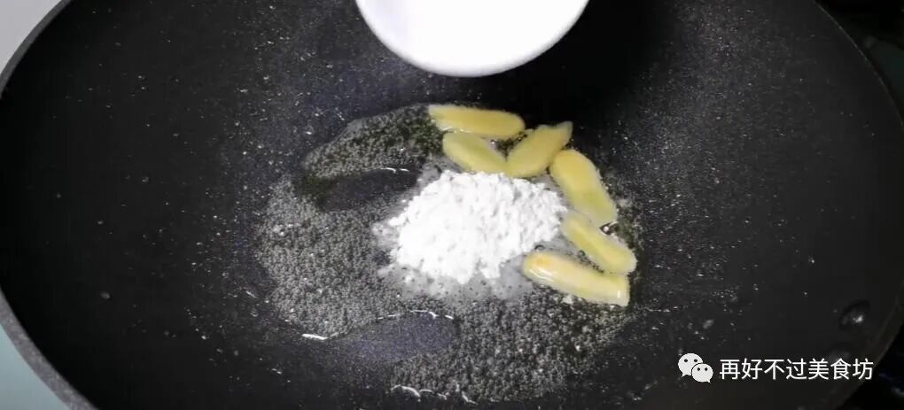 3、锅内加入少许油,开小火烧至三成热,先下姜片煸香,炒香后加入十克面粉,把面粉划开炒散。