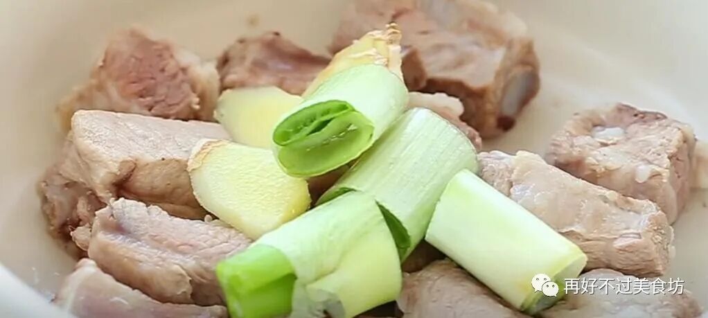 2、捞出排骨放入砂锅中,加入切好的葱段和姜片,再加入适量的清水,大火煮沸后,改小火炖煮大约40分钟。
