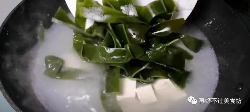 6、五分钟后,淋入少许香油,再撒入葱花后即可完成。这样一道海带结豆腐汤既营养又好喝,汤色浓白,味道鲜美,做法还简单,希望您能够喜欢。