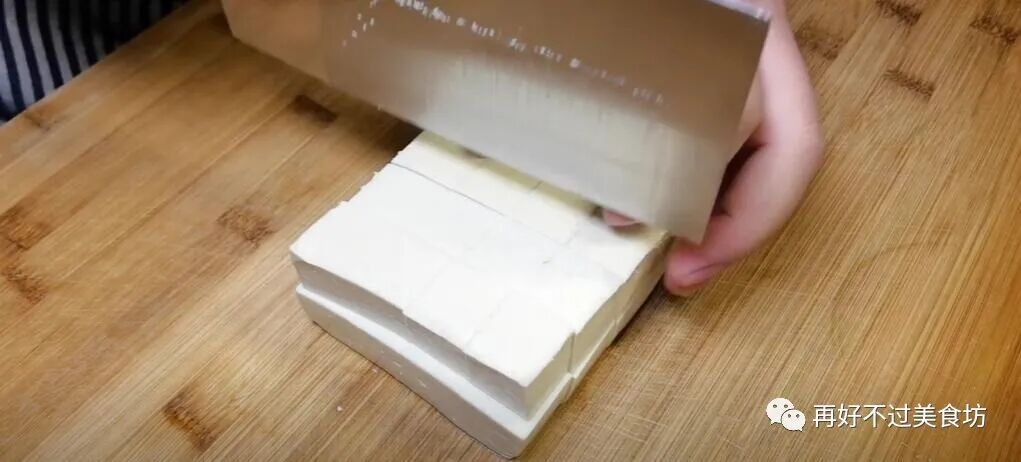 1、秋季饮食汤汤水水不能少,用这块嫩豆腐做一道好喝的汤,豆腐从中间切开,再切成两厘米的正方形,切好装盘备用。