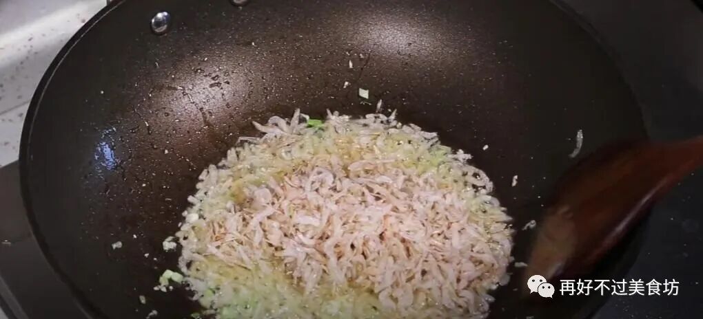 2、锅烧热后加点油,锅里爆香葱姜蒜末,在虾皮下去爆香,这道菜主要是虾皮一定要过油。