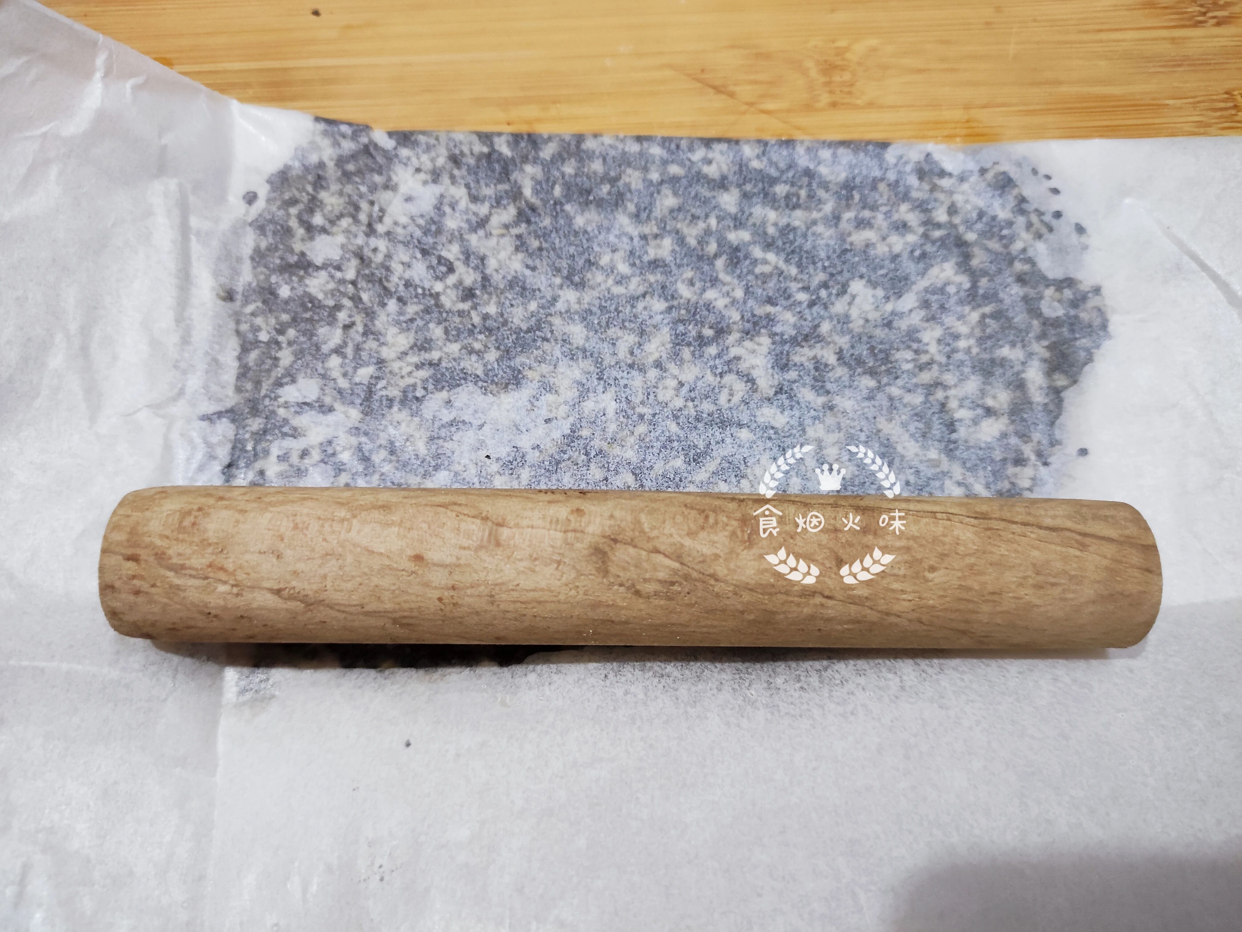 13.油纸对折起来,用擀面杖将它们压平,压成薄薄的饼状。盛出跟压平这个动作也是要快,现在天气冷,糖浆遇冷后,很容易就凝固了。