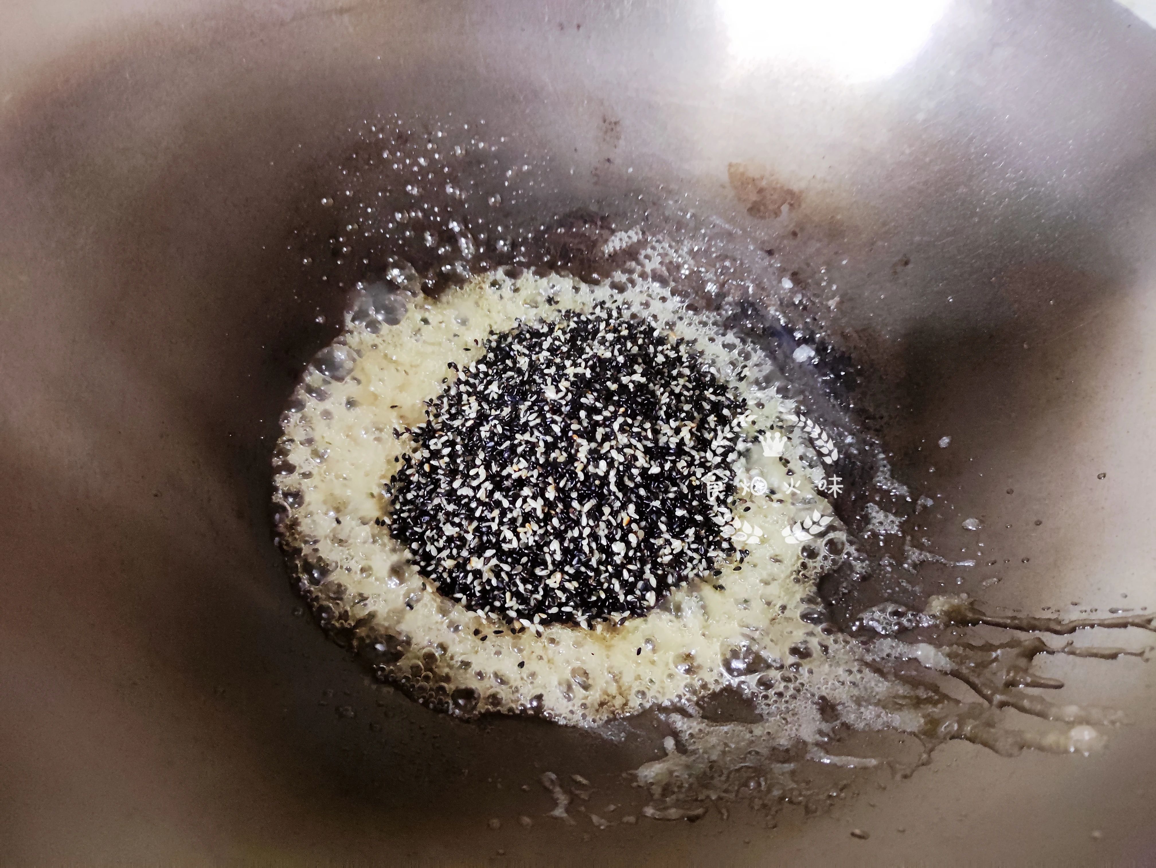 10.往糖浆中倒入熟芝麻,迅速地用铲子将糖浆与芝麻炒均匀。