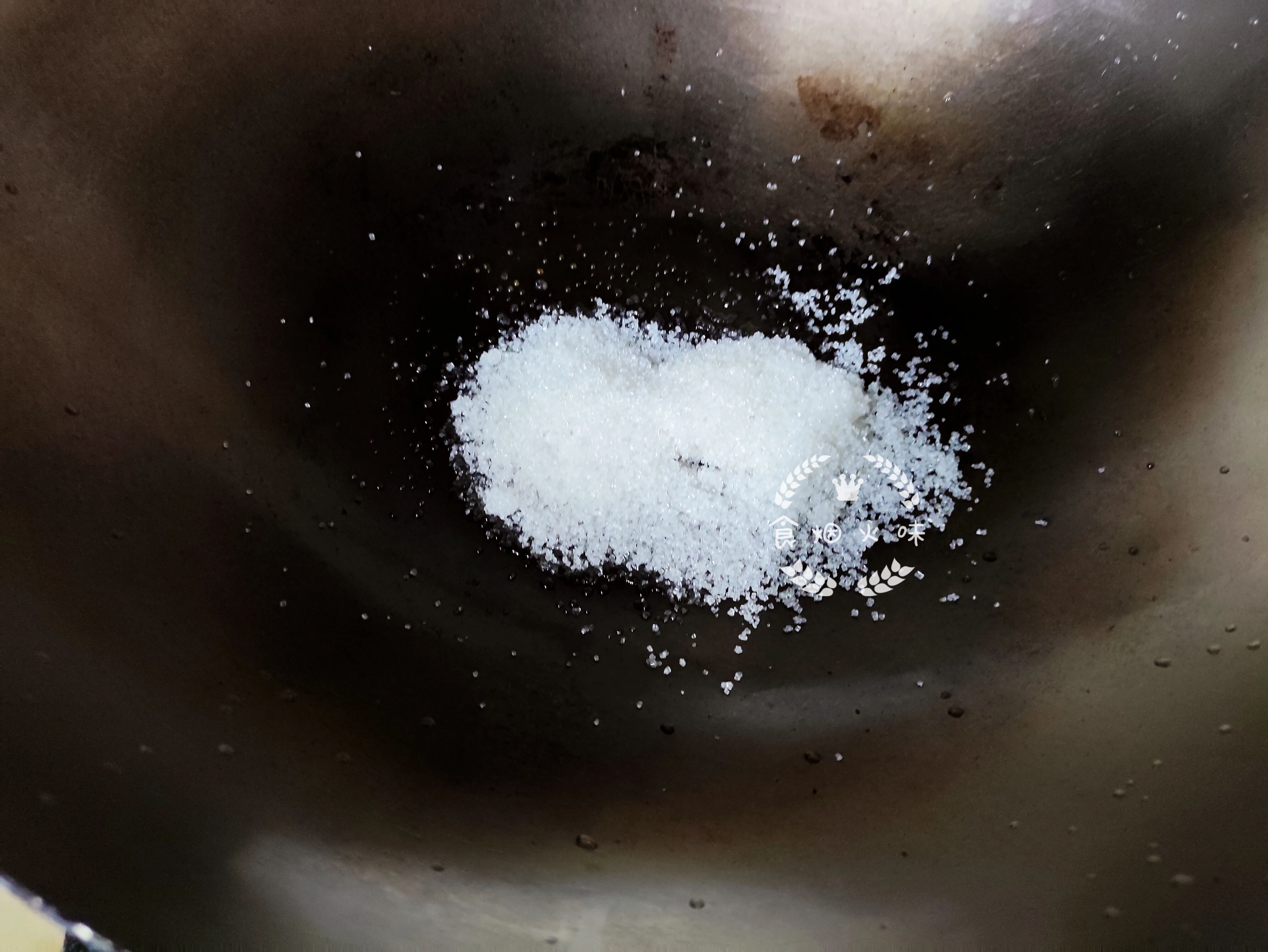 8.往白糖中加入一点点的水,加入水是为了更方便炒糖浆。