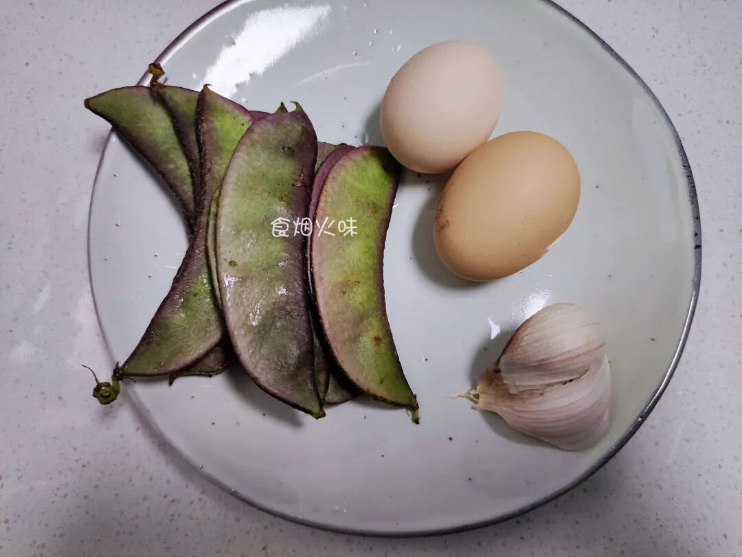 紫扁豆,鸡蛋,蒜瓣,食盐,鸡精,食用油,酱油