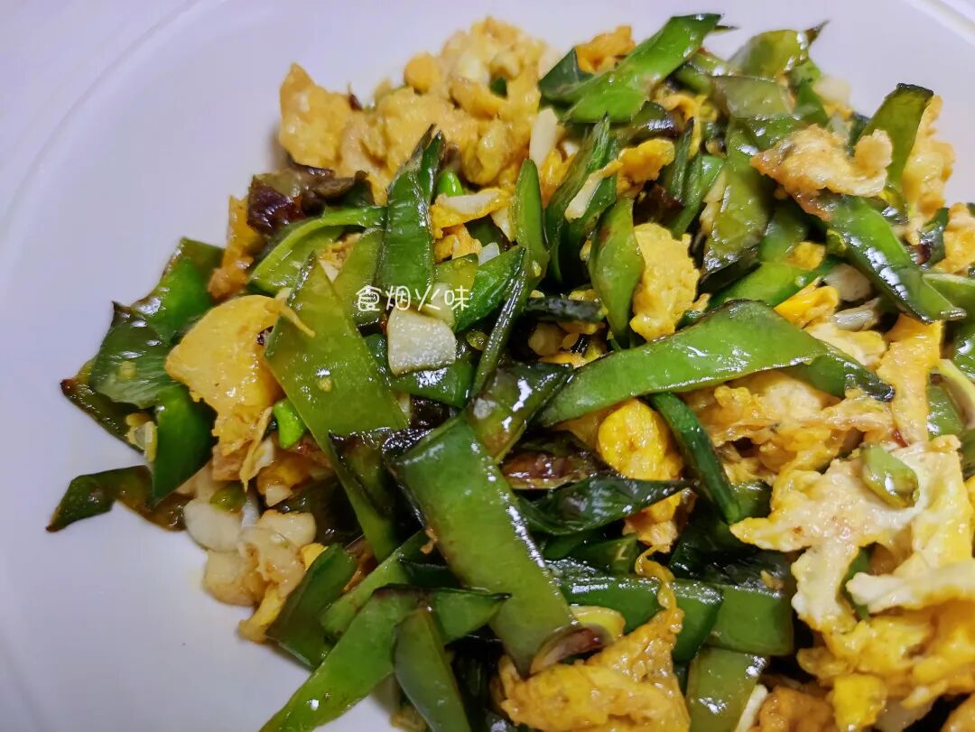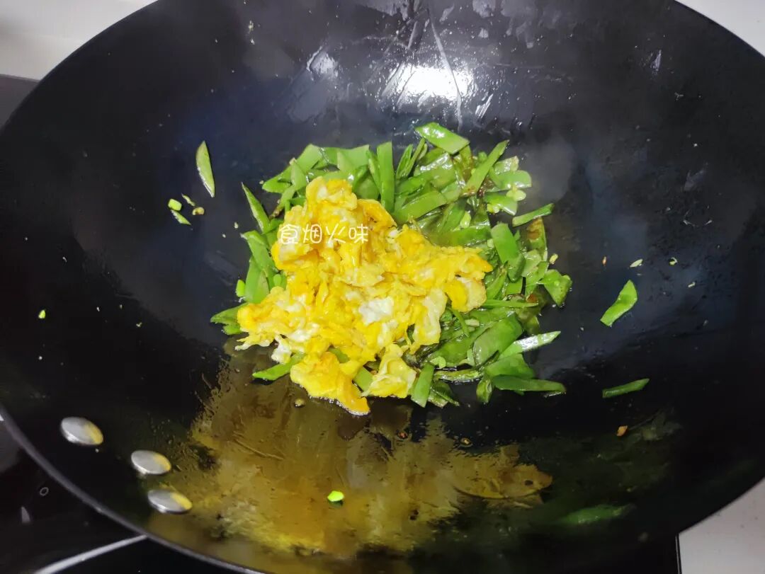 5.锅中再次倒入一点点的食用油,将切好的扁豆倒入锅中,铲子将它们翻炒均匀。炒扁豆的时候,要用小火煸炒,炒的过程中勤翻动。将锅中的扁豆煸炒至表面都有点皱皱,将鸡蛋倒入锅中;