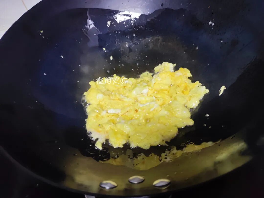 2.要想鸡蛋嫩滑,可以在鸡蛋液中加入一点点的水搅拌均匀。先下锅炒至成块,捞出放在碗中备用;