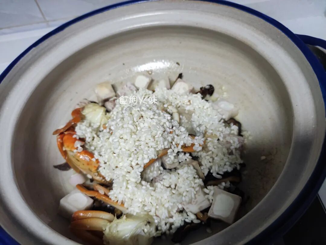 4.将芋头,大米还有鲟也倒入炒香,多翻炒片刻,炒至米有点粘;