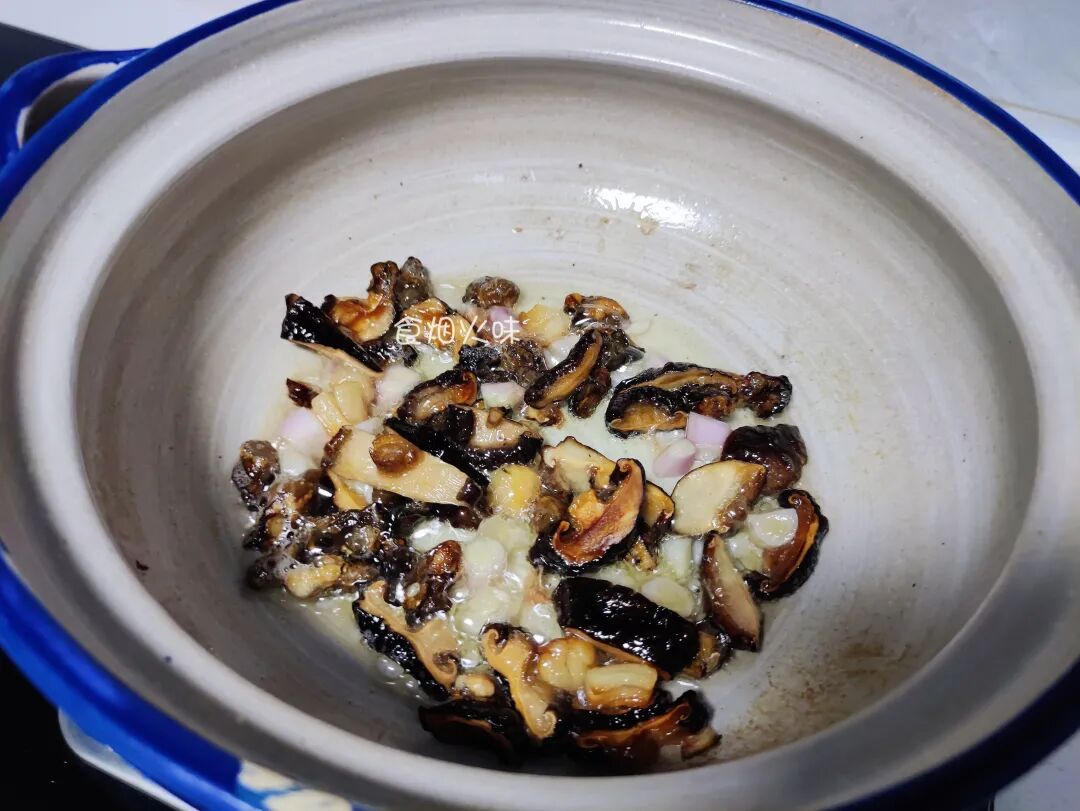 3.准备一个干净的砂锅,锅中水分干后,倒入适量的油。将准备好的香菇,海蛎,干贝倒入里面用小火将它们煸炒出香味来。炒的过程中用铲子勤翻动。个人觉得熬煮的话,食材要先下锅炒,出锅后的粥浓郁鲜香好吃;