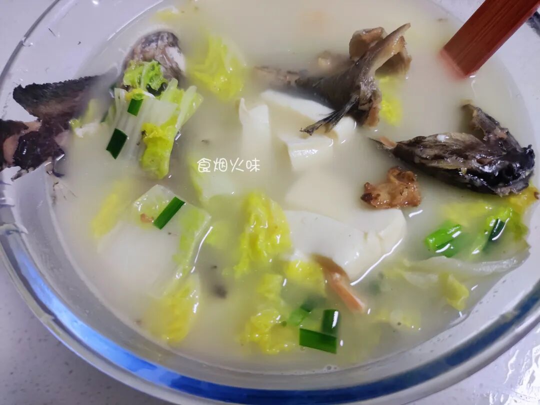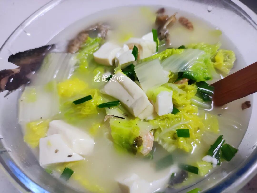 白菜,虾米。嫩豆腐,还有野生小鱼(这个没有可以不用),生姜,葱花,食盐,食用油