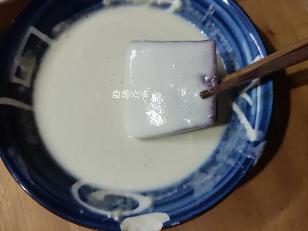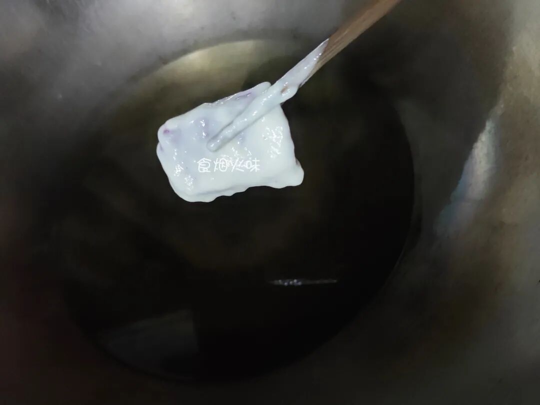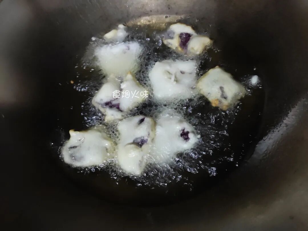 5.将切好的紫薯片倒入面糊中,轻轻翻动一下,将整个紫薯表面都能裹上一层面糊,裹上面糊的紫薯炸出来外酥脆里面软糯,真好吃。