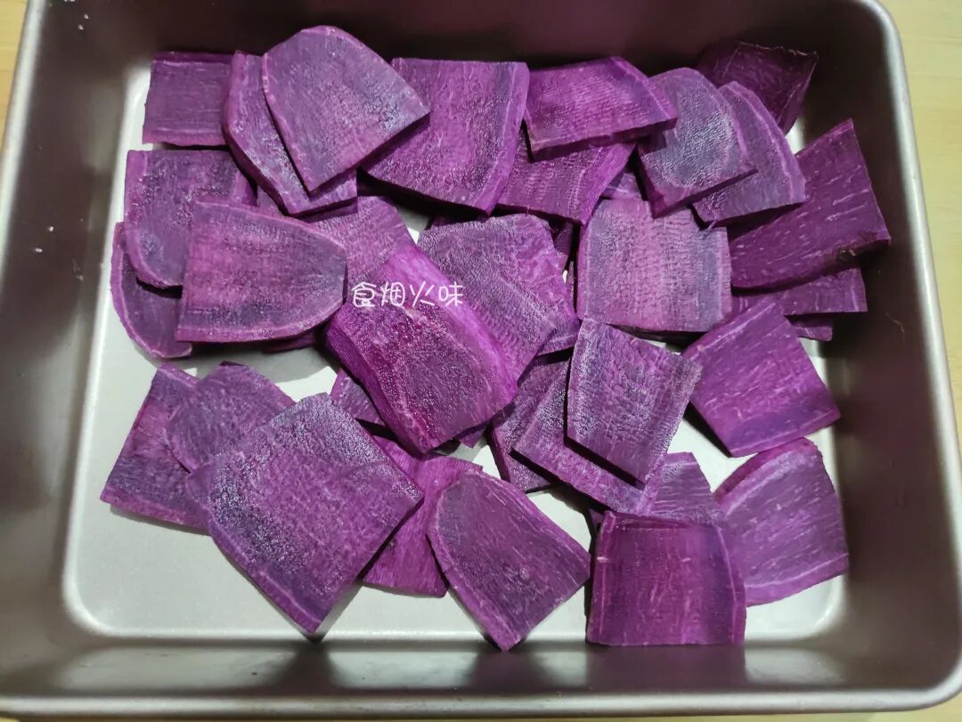 2.紫薯表面沥干水分后,将其切成均匀小块,再用刀切细片,切好的紫薯盆中备用。紫薯薄厚要0.2㎝左右,太薄太厚都不行。