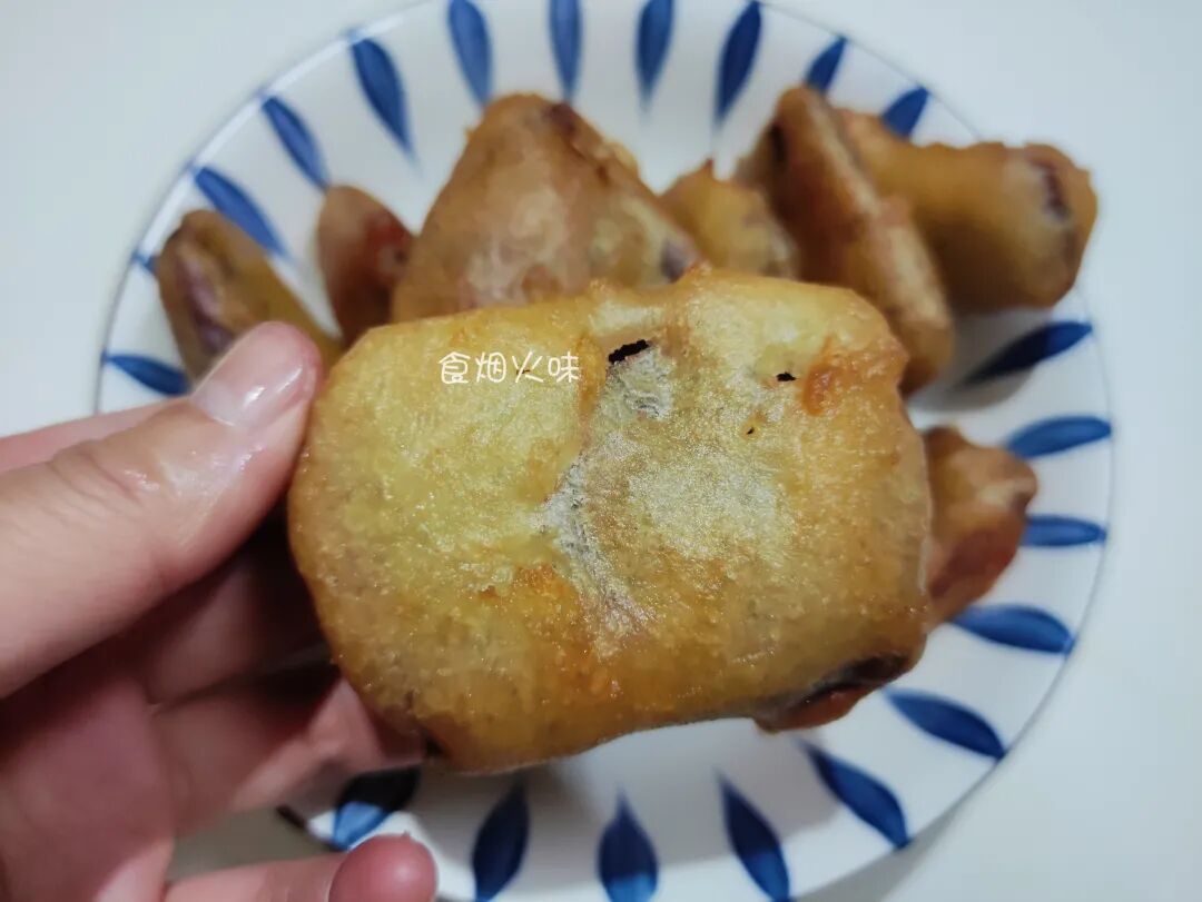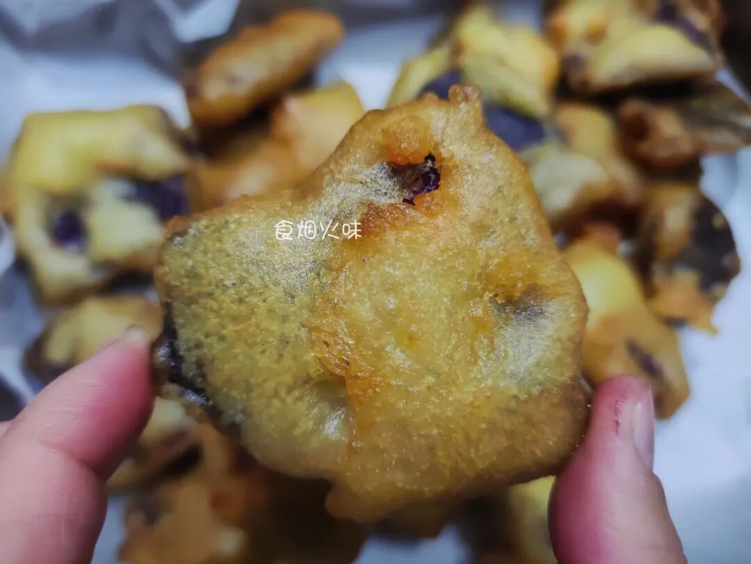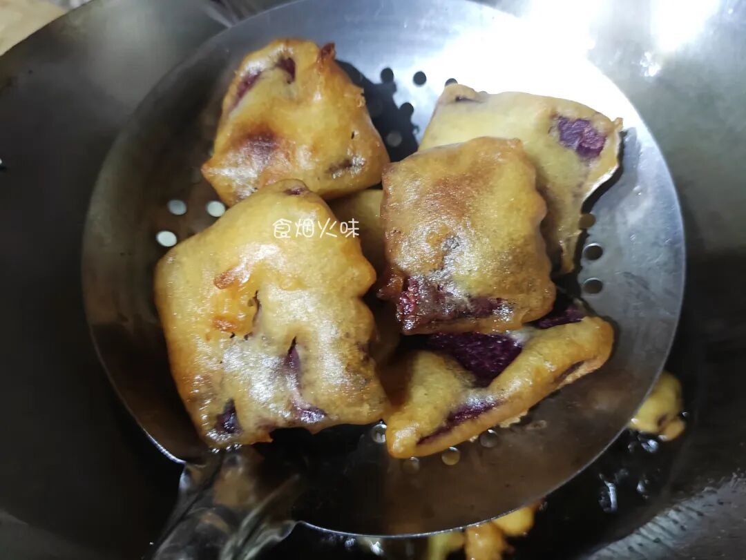 9.因为面糊中加入了啤酒,在炸的过程中面糊很容易变得膨大。炸至地瓜片表面金黄状态捞出放着。