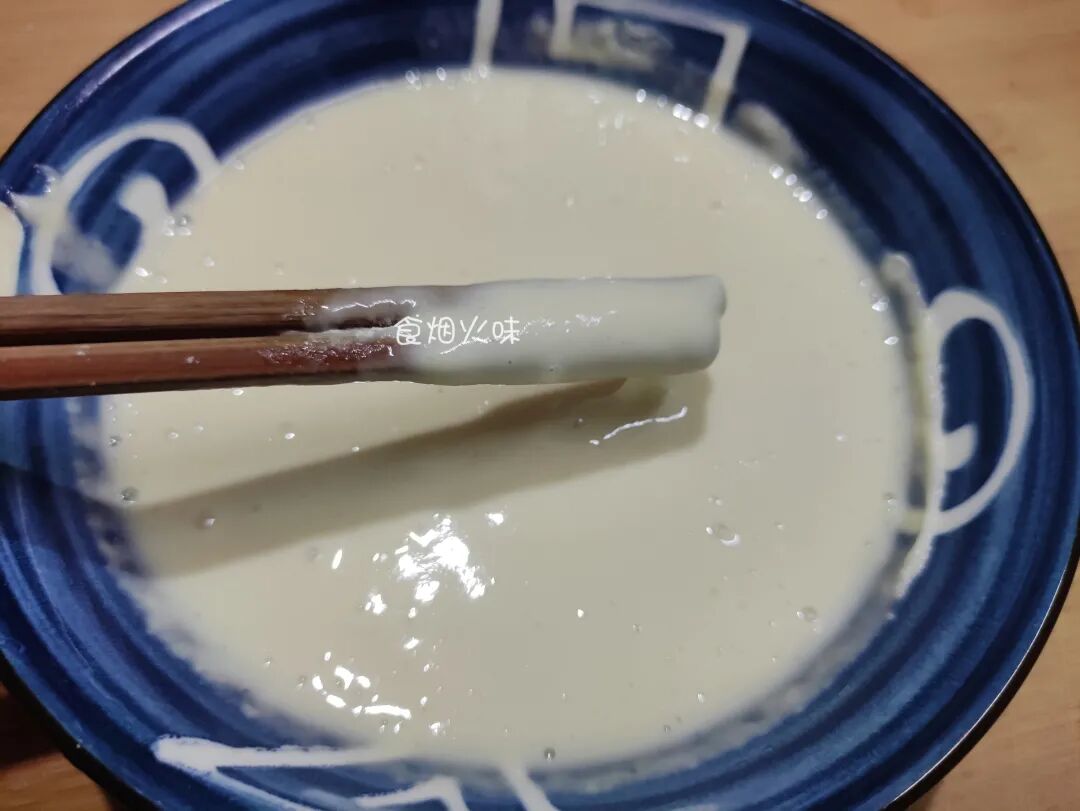 4.啤酒加入后,用筷子轻轻将食材搅拌均匀,要搅成这糊状,才能挂糊。