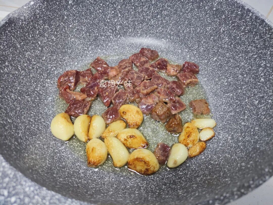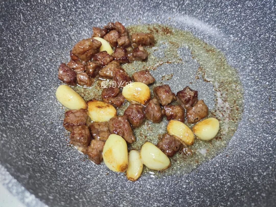 4.锅中的蒜瓣煎至两面焦黄后,倒入切好的牛肉丁。用铲子将锅中的食材摊开,然后放在煎煮;