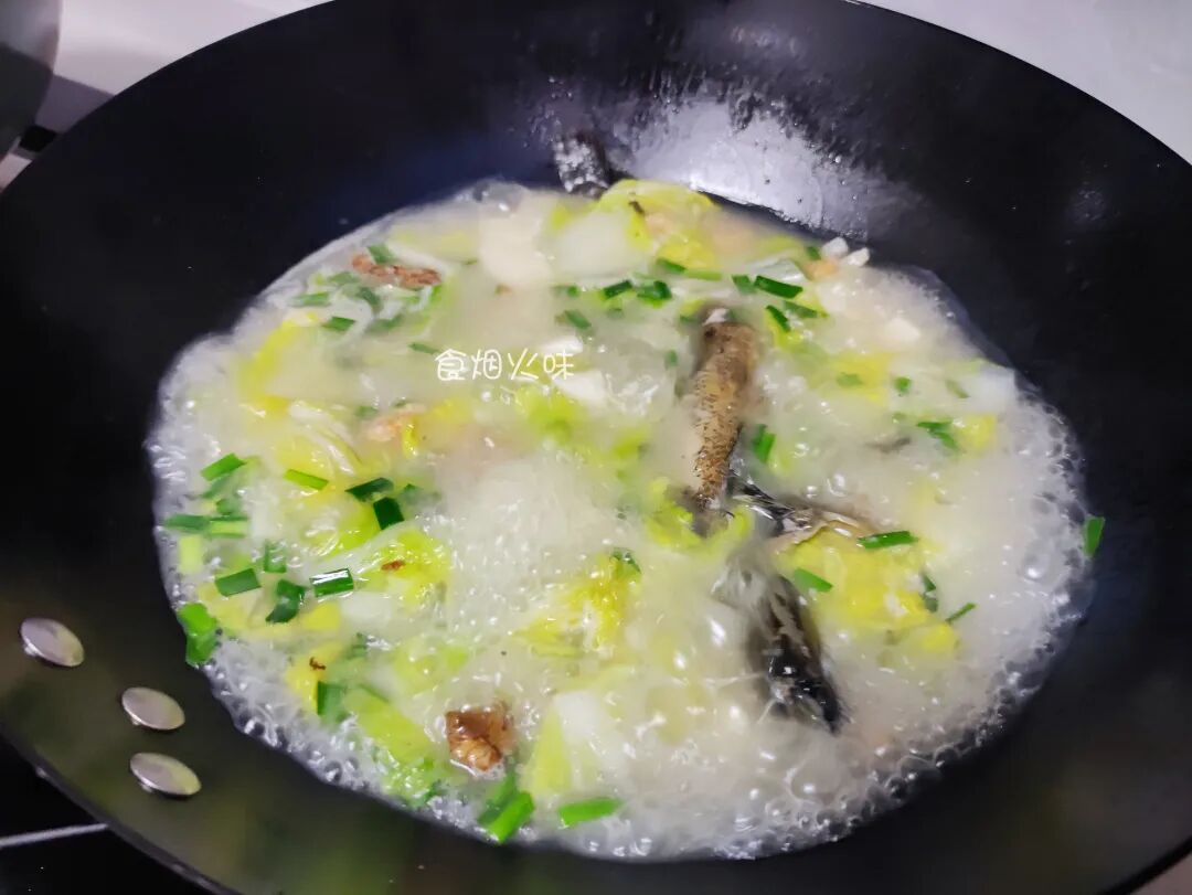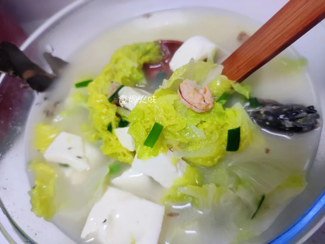 白菜,虾米。嫩豆腐,还有野生小鱼(这个没有可以不用),生姜,葱花,食盐,食用油