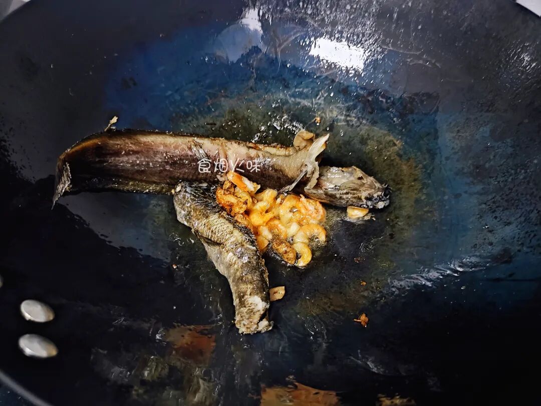 3.准备一个干净的锅,锅中的水干后,倒入适量的生姜片,将它们煸炒出香味来,然后鱼放入里面,煎至两面焦黄。洗净后的虾米倒入里面煸炒出香味来;