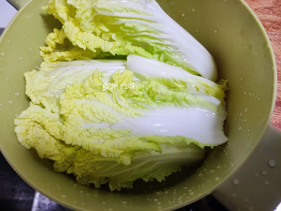 1.准备好的白菜放在盆中,用手将白菜折成一叶叶的,折好后放在盘中,里面加入适量的水,食盐浸泡。将浸泡好白菜叶子用手搓洗干净,洗净捞出放在清水中洗净。洗净的白菜放在案板上,用刀切成细段,切好放在一旁备用;