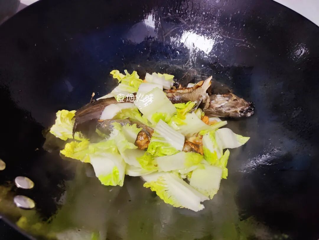 4.白菜真的是越炖煮越好吃,食材炒香后,切好的白菜茎倒入锅中,用铲子将它们翻炒均匀,炒香。然后倒入适量的冷水,盖上盖子,中大火焖煮;