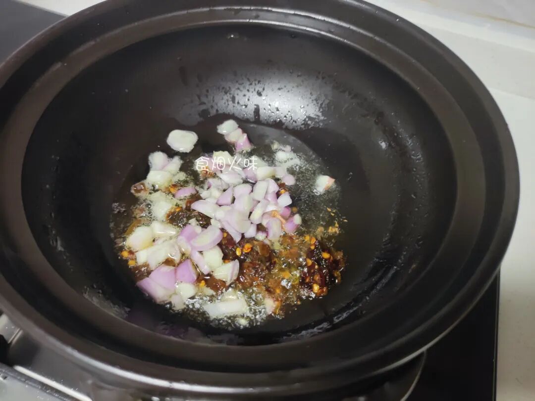 2.将葱头还有少量的蒜泥放入砂锅中煸炒出香味;