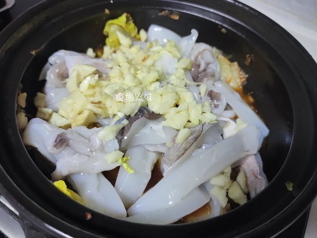 4.食材炒香后,将切好的白菜均匀地摆放在上面,盖上盖子焖煮1-2分钟。让白菜煮焉了,白菜煮得越久,煮出来越是入味,口感越好。白菜煮焉后,摆放切好的墨鱼片,再上面撒入适量的蒜泥,随后再次盖上盖子焖1分钟即可;