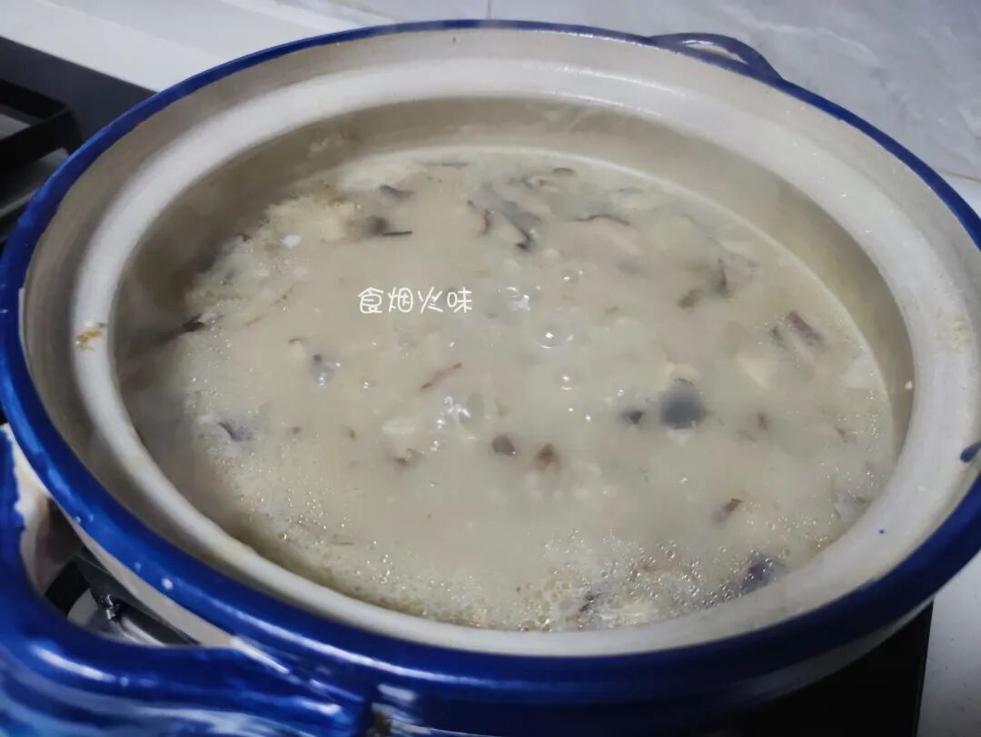 7.慢慢熬煮,煮到锅中的食材变成这种稠状,将肉跟皮蛋丁倒入里面,再次用勺子将它们搅拌均匀,然后加入食盐,鸡精调味即可。