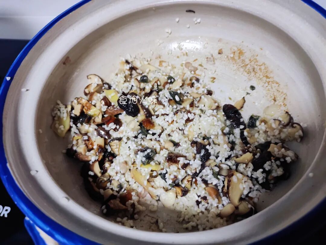 4.将切好的皮蛋丁跟香菇也倒入里面,皮蛋不要全部倒入里面,要留1/3的量,等会会用刀。食材放入锅中,用铲子将它们翻炒出香味来。食材要多炒一会儿,这样出锅后的口感鲜美,没腥味;