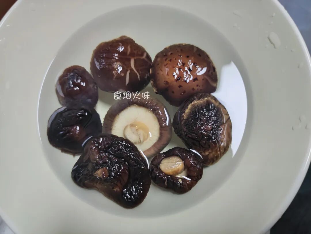 1.家里有干香菇,最好用干香菇。这种味道浓郁鲜美,而且口感Q弹有嚼劲,比新鲜的好吃很多。准备好的香菇放在盆中,加入适量的温水浸泡30分钟。干香菇中含有碱性物质,煮之前要将其泡发洗净,口感才会好。温水加快泡发,营养不流失。泡发的香菇放在案板上,用刀切成细段,切好放在盆中备用;