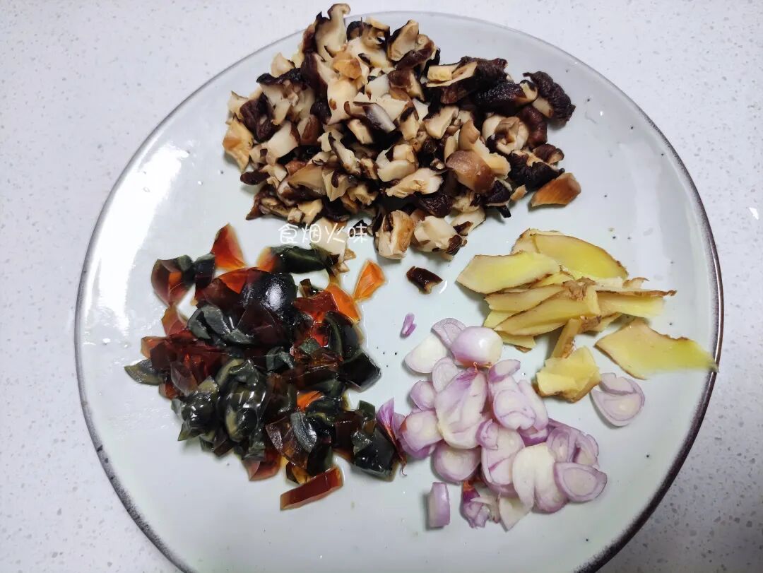 1.香菇先放在温水中浸泡,香菇一定要浸泡透了才好吃,浸泡好后的香香菇切成丁,切好放在一旁备用;