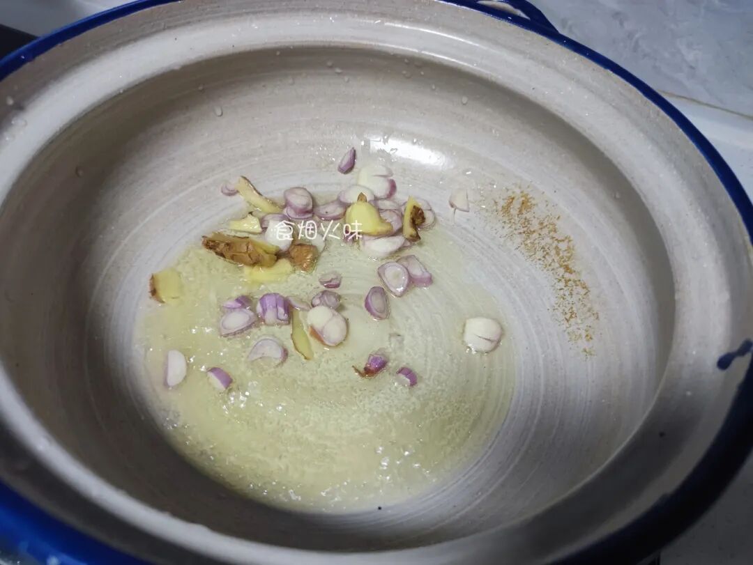 3.准备一个干净的砂锅,锅中的水分干后,倒入适量的油,将准备好的生姜片跟葱头倒入里面,用小火将它们煸炒出香味来;