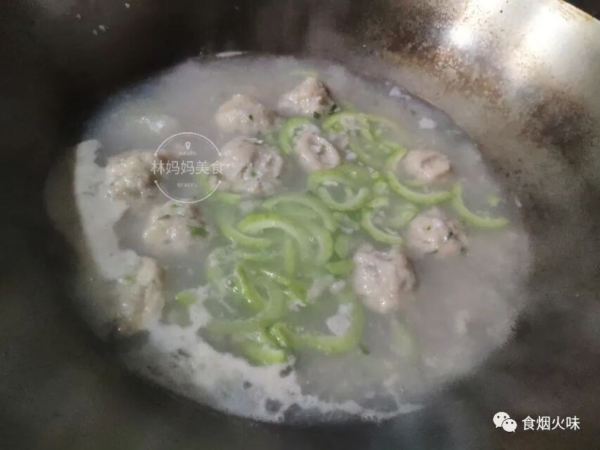 9.煮熟的丸子漂浮上来,直接捞出放盆中,锅内还剩余几个丸子,将角瓜切细干净,切细,然后放入锅内,便成为一道美味的营养汤,鲜甜又易消化。