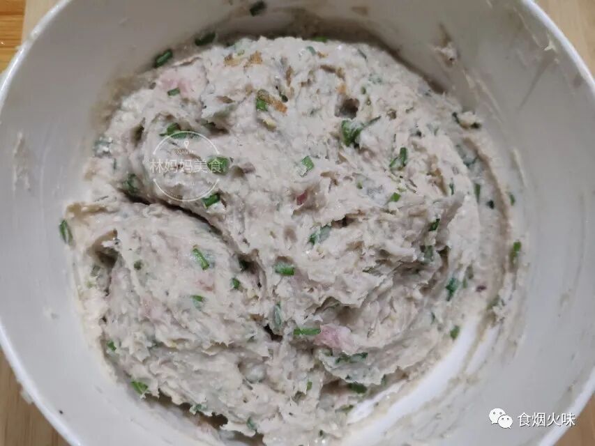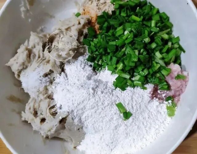 5.将搅拌好的芋头板栗泥跟肉泥放入大盆子中,将韭菜切细放入盆中,倒入胡椒粉,椒盐,盐巴,还有地瓜粉,然后一起搅拌均匀。