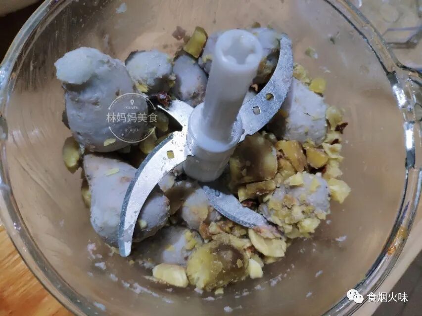 3.由于下锅水煮之前在背后割两刀,导致很难剥皮,没有剥到一个完整漂亮的板栗,不过并不影响其口感。将剥好的芋艿跟板栗放在绞肉机搅拌。