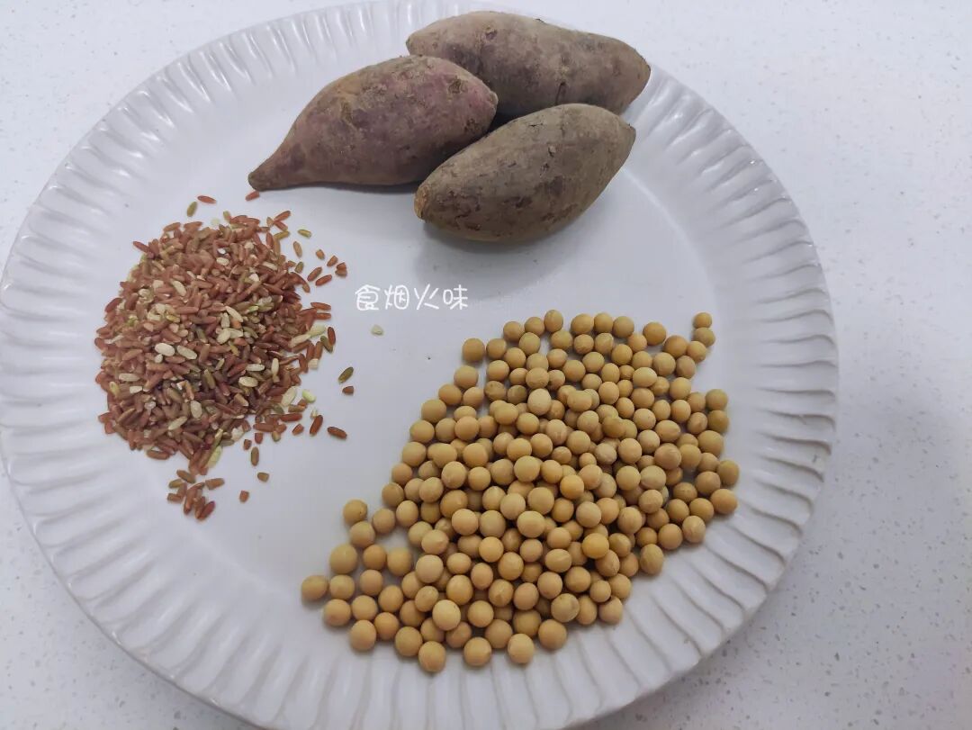 紫薯,红米,黄豆,还有黄冰糖(不喜欢吃太甜,也可以不用添加,因为紫薯也是有淡淡甜味)