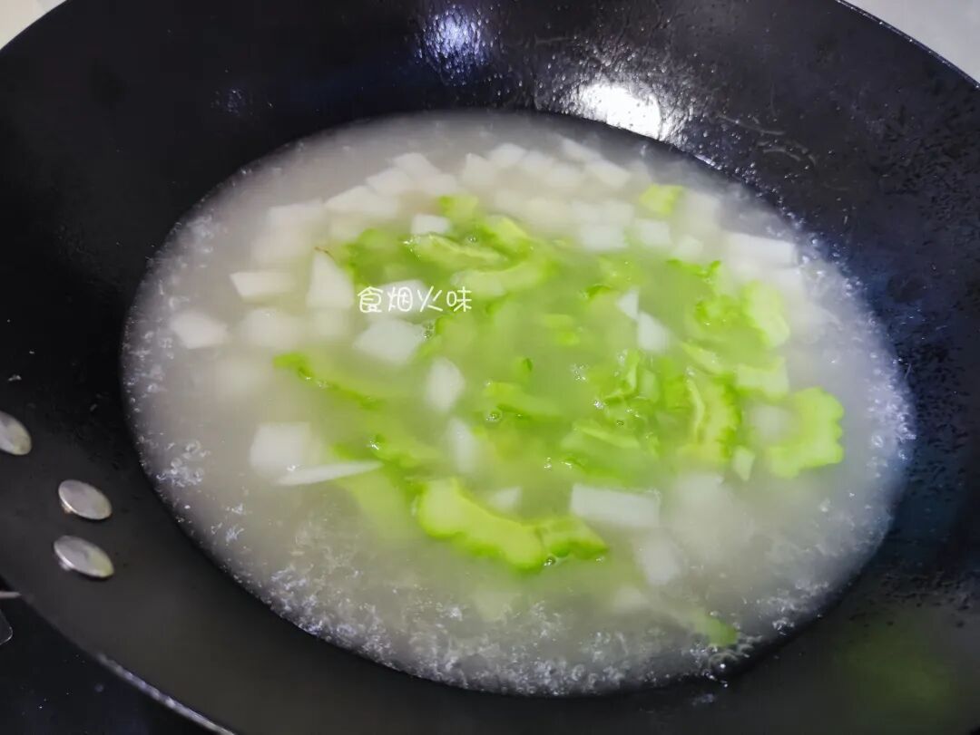 6.锅中的汤汁放着让它煮开,多滚几次汤,里面的汤汁会变得鲜白。腌好的苦瓜用清水冲洗干净,洗掉里面的苦水,倒入里面,盖着煮1分钟左右。苦瓜焖煮久了颜色会变黄,所以盖上盖子后不能煮太久。或者加入苦瓜后,不再盖盖子,就这样放着煮。煮好后,加入适量的食盐调味即可关火出锅。