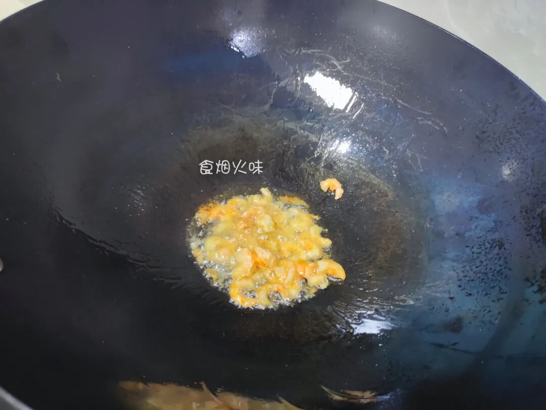 3.准备一个干净的锅,锅中的水分干后,倒入适量的油,将虾米倒入里面。小火翻炒,煸炒出香味。下锅前的虾米记得要尽可能地沥干水分,防止炒的过程中会溅油;