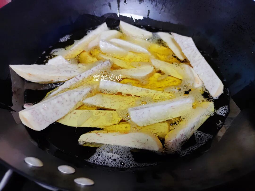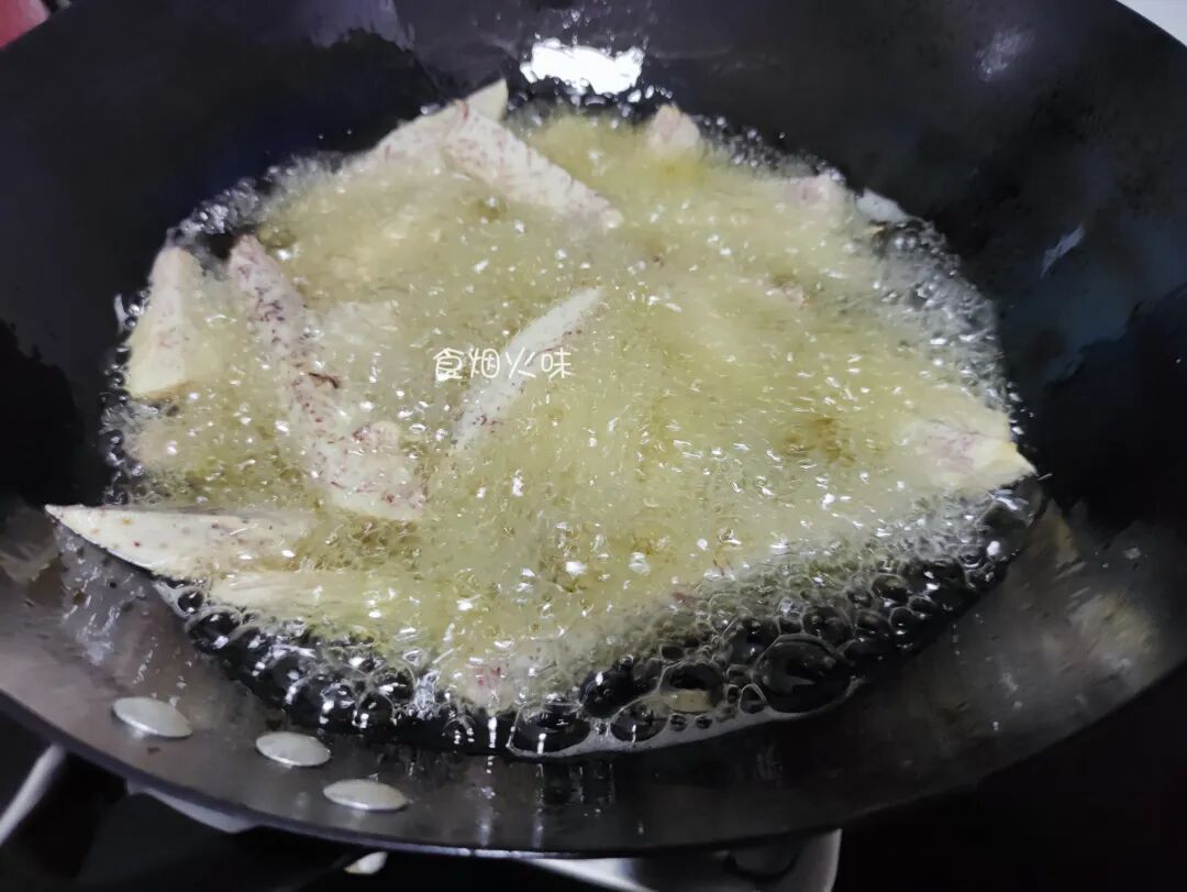 5.锅中的芋头炸至成这种状态,表面焦脆,用筷子轻轻一掐,很快加掐进去的说明炸的可以了;
