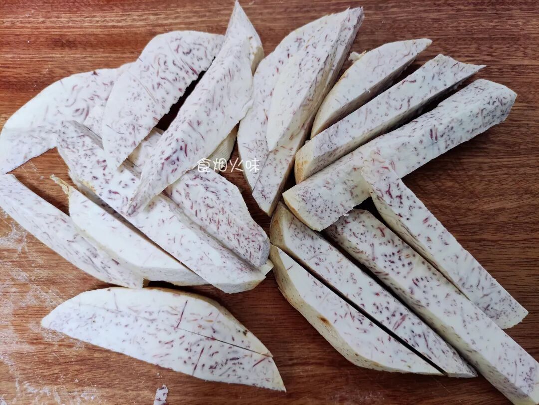 2.芋头等会要下油锅炸,所以切记要沥干水分,防止在下锅的过程中会溅油,产生不必要的麻烦。将准备好的芋头放在案板上,用刀将其切成小段,不要切太细,差不多一厘米的厚度。切好的芋头放在一旁备用;