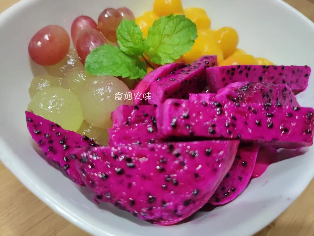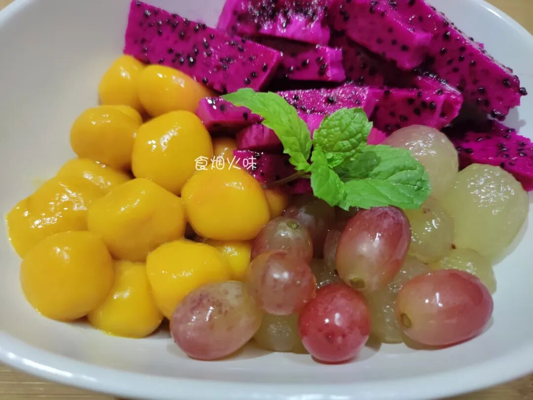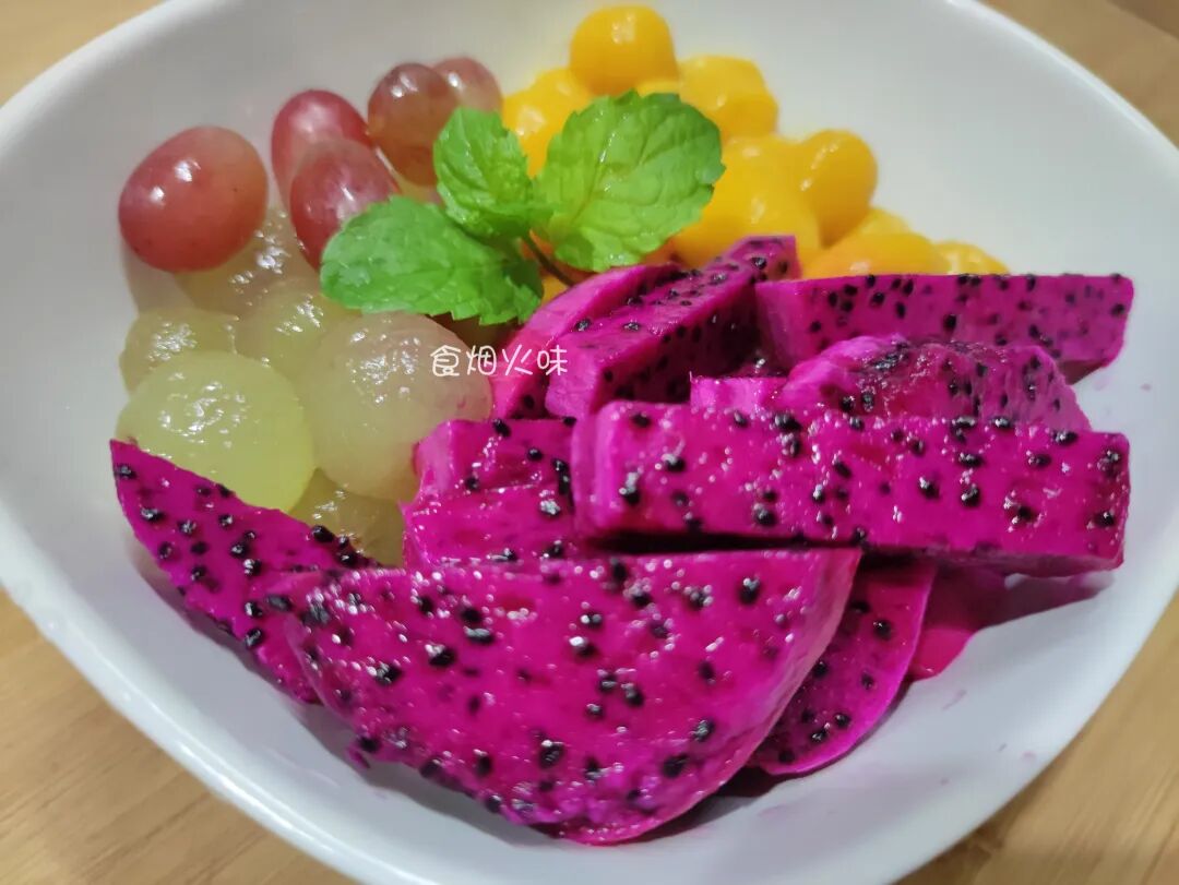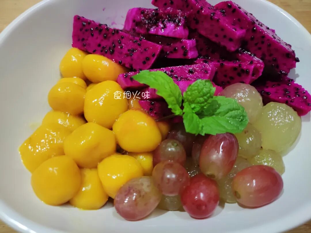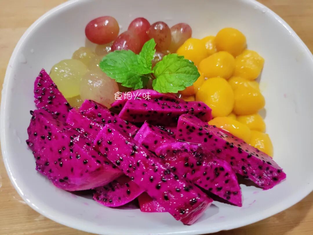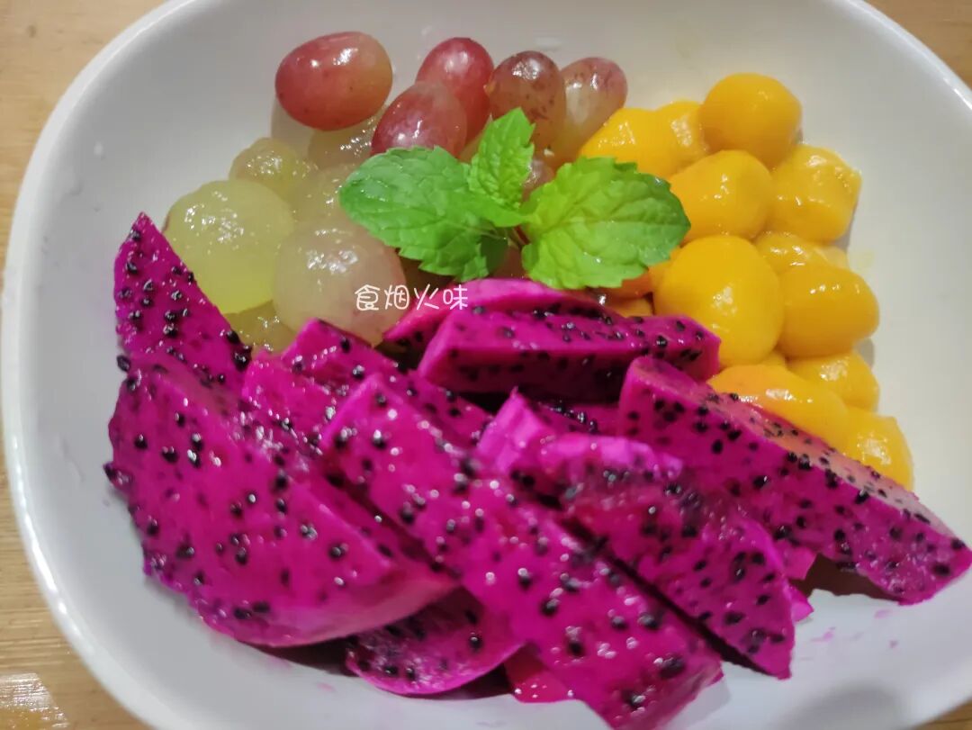 有各种水果,还有软糯有嚼劲的南瓜丸子,最后放入薄荷叶点缀一下,有红有绿,还有黄,色彩艳丽,饱满,看着就特别有食欲。季节交替时期,而且入秋后的天气相对干燥,这样一份美食就很适合吃。补充维生素,还有开胃解暑还防燥接疲劳。