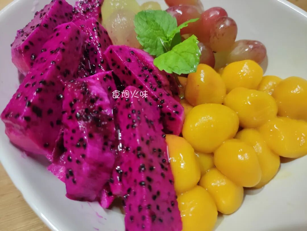 火龙果将其表皮去掉,用刀切成细块,切好的也放在上面。还有喜欢的水果也可以加上去,随后倒入适量的蜂蜜,这样一份水果捞南瓜丸子就完成。