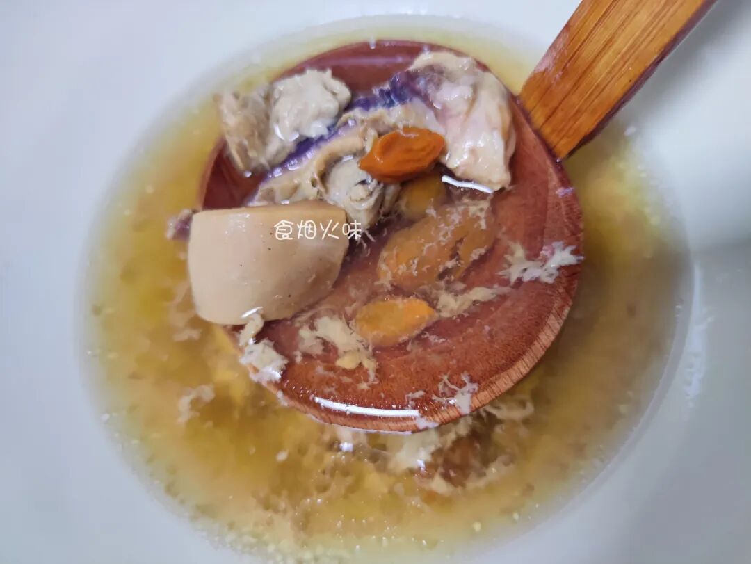 3.枸杞补气,还有淡淡的甜味加上瘦肉跟墨鱼干的鲜味,使得整道汤很鲜甜,出锅前只需加食盐调味即可。