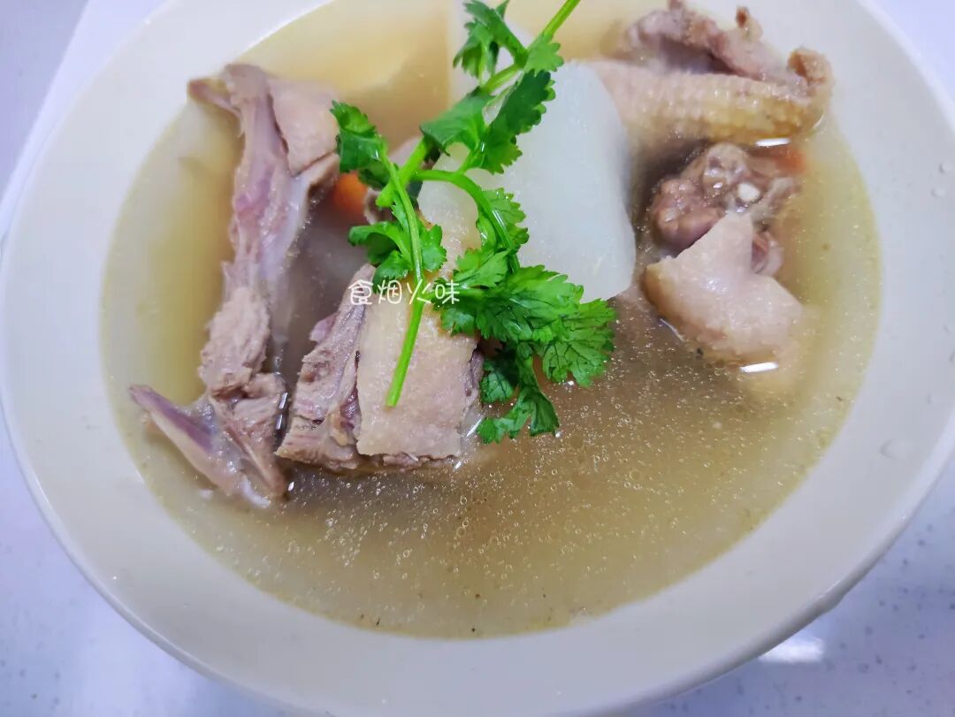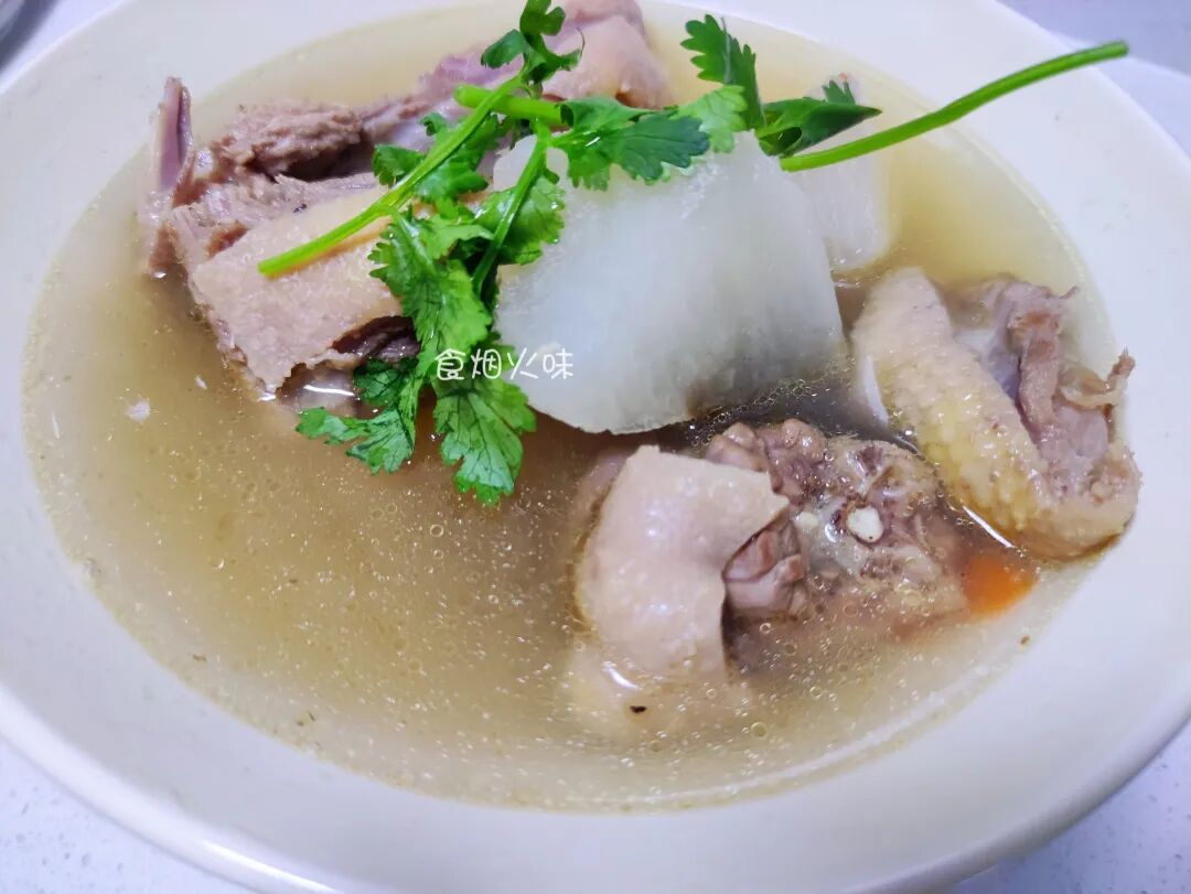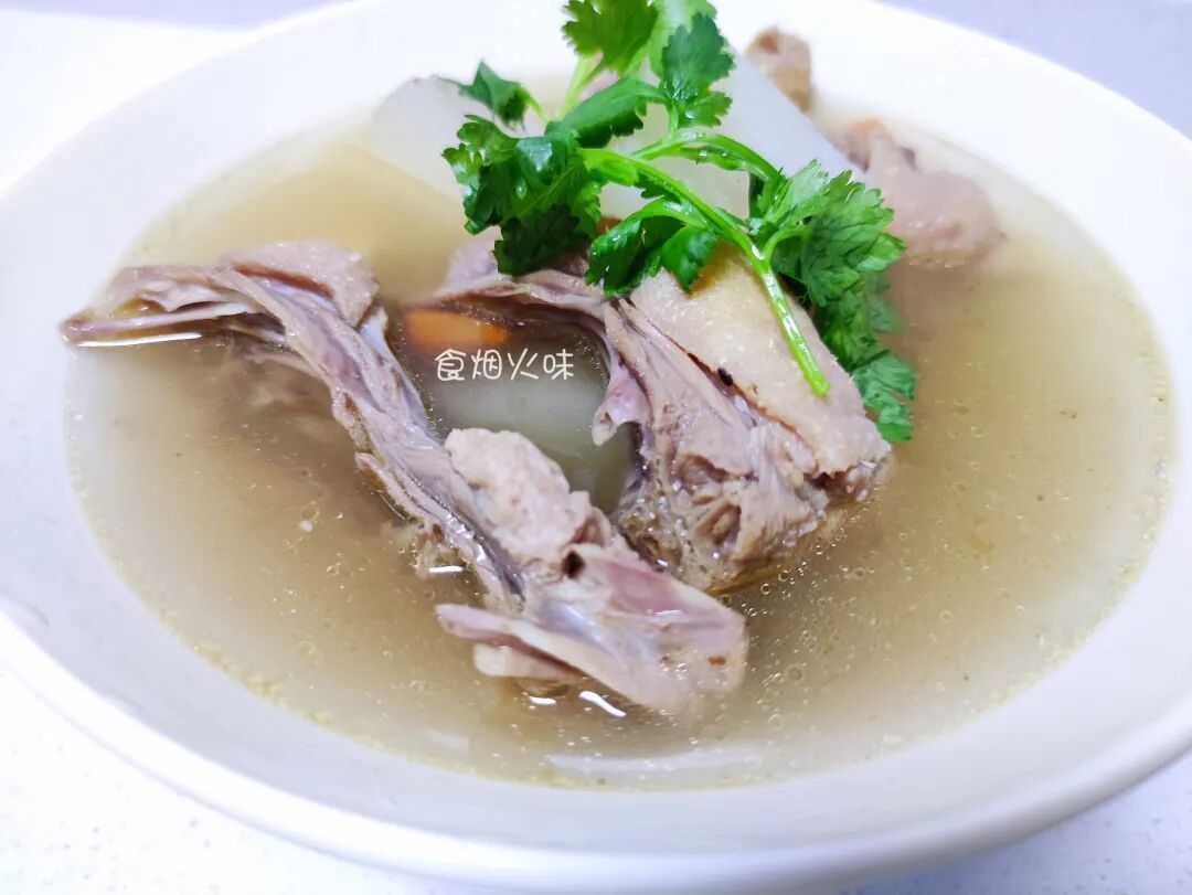 这样炖出来的汤汁鲜甜,清爽不油腻,最好将准备好的香菜放在上面,增添色彩,看起来有食欲多了。有的人说,鸭肉很肥,如果再下锅加麻油炒会更油腻,其实也还好,关键是有白萝卜可以吸油,使得汤汁清爽甘甜。