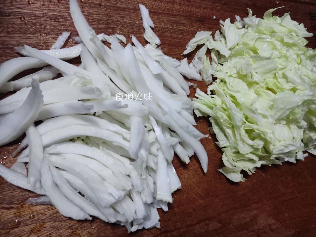 1.准备好的食材放在盆中,用手将大白菜撕成一叶叶的,然后顺便放入盆中,里面加入食盐,水浸泡20分钟。用食盐水浸泡大白菜有杀菌消毒的作用,吃起来更放心。用手将大白菜的根茎搓洗干净,那个地方容易摸起来滑滑的,搓一下,才能洗净。洗净后放在清水中再次冲洗干净,洗净后的大白菜沥干水分。放在案板上,用刀将它们切成小段,切好的茎跟叶子要分开放;