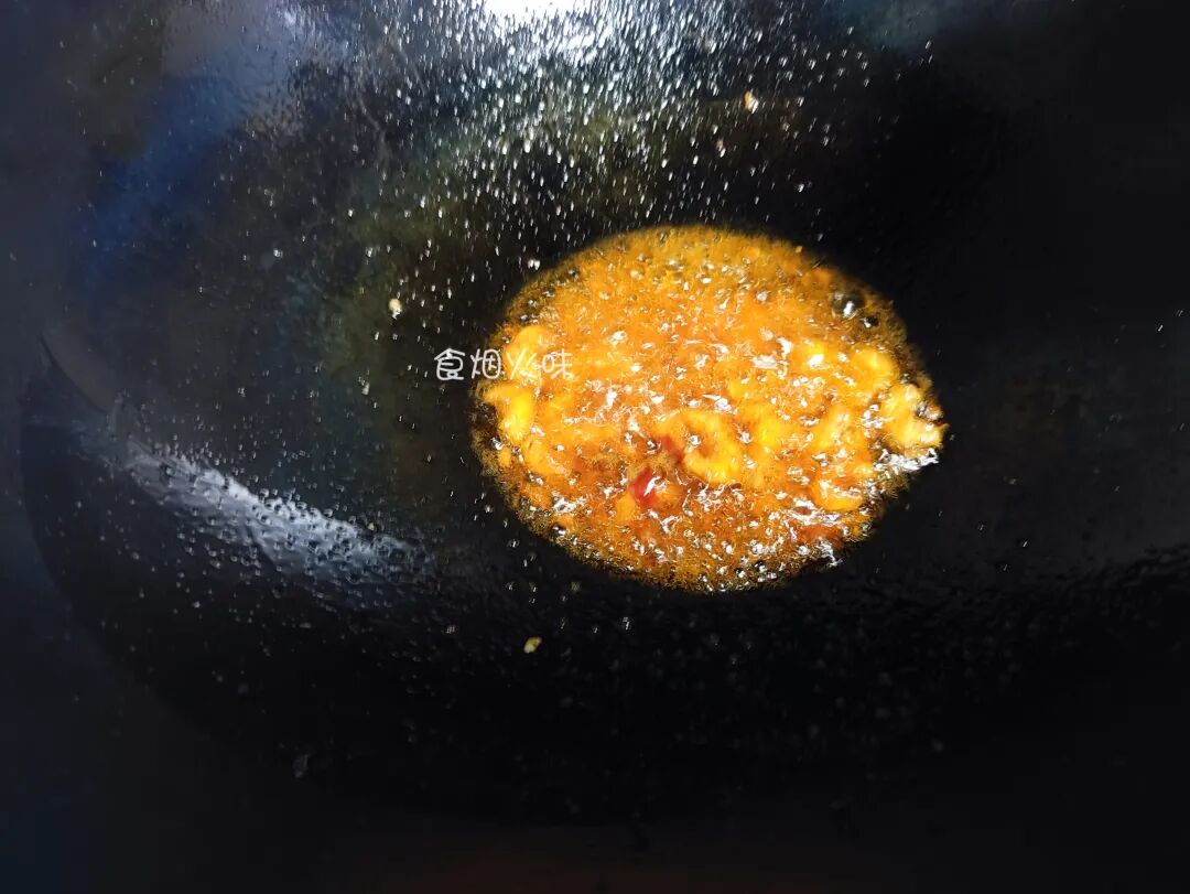3.准备一个干净的锅,锅中的水分干后,倒入适量的油。这个时候转为小火,虾米轻轻倒入锅中,用铲子将它们翻炒均匀。炒的过程中,虾米会散发出香味来,往里面再加入一点点的豆瓣酱,用铲子将它们翻炒均匀,炒香;