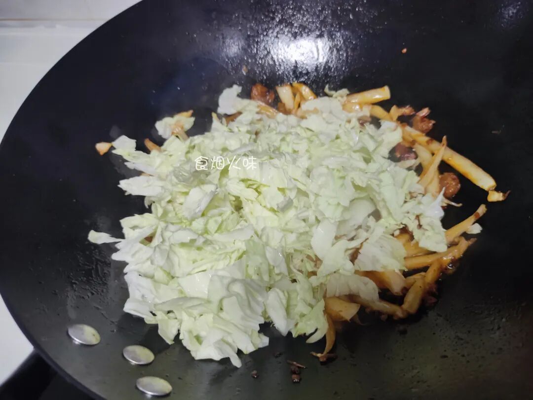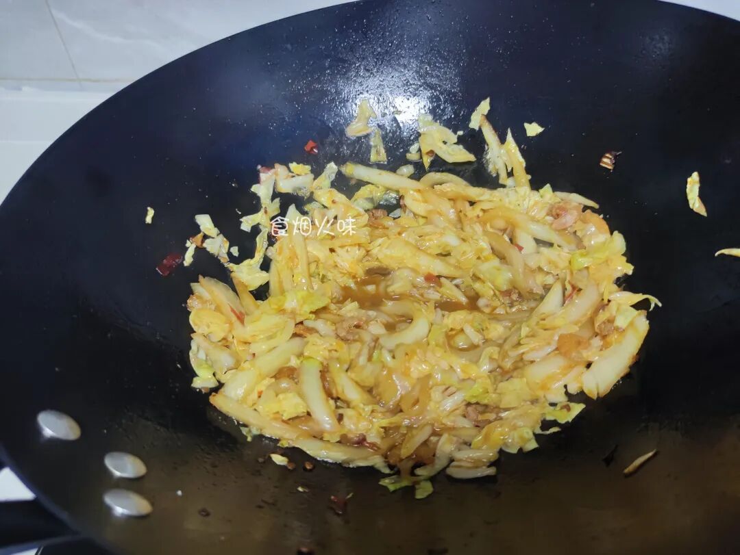 4.白菜茎在锅中多次翻炒后,将准备好的白菜叶子也倒入里面,用铲子将它们翻炒均匀。白菜中含有的水分很高,炒的过程中会有汁水,这是正常。而且经过炒,体积也变小;
