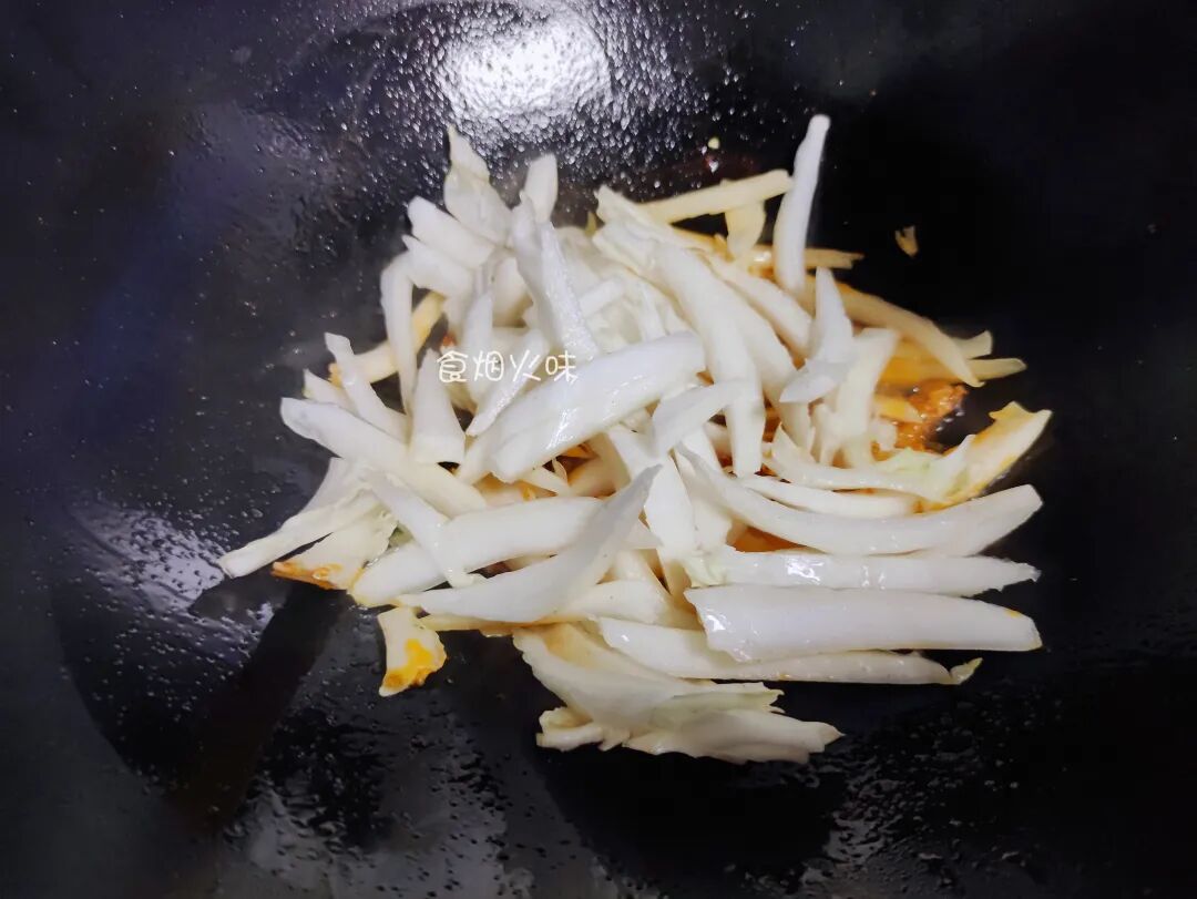 5.一开始就加入一些豆瓣酱,而豆瓣酱不仅有一点点辣味,还有咸香味。到最后只要再加入少量的食盐调味即可,用铲子将它们翻炒均匀炒香即可关火出锅了。
