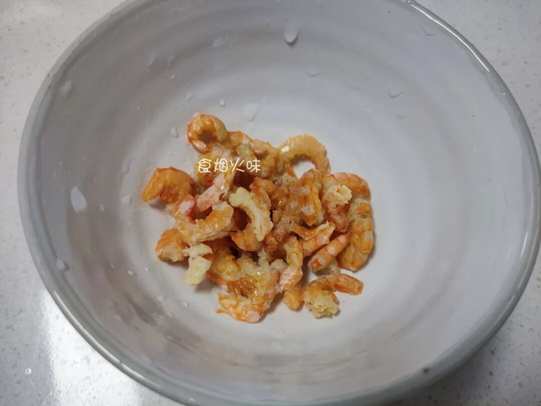 2.虾米是这道菜的精华所在,口感鲜美,营养极高的虾米跟大白菜是绝配。准备好的虾米放在盆中清洗干净,洗净放在碗中备用;
