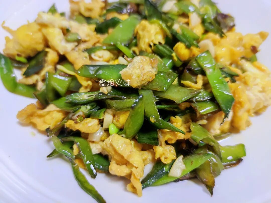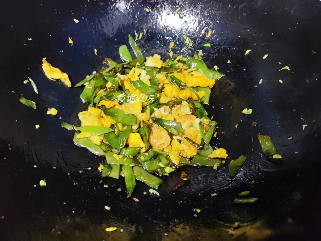 5.锅中再次倒入一点点的食用油,将切好的扁豆倒入锅中,铲子将它们翻炒均匀。炒扁豆的时候,要用小火煸炒,炒的过程中勤翻动。将锅中的扁豆煸炒至表面都有点皱皱,将鸡蛋倒入锅中;