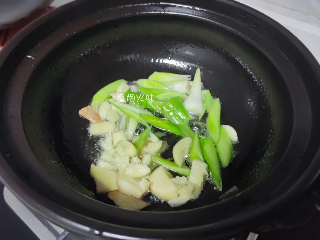 4.准备一个干净的砂锅,锅中的水分干后,倒入适量的油。锅中的油热后,将蒜茎跟生姜蒜瓣倒入里面,用小火煸炒一下。炒的过程中翻动,使其受热均匀,煸炒出里面的香味来;