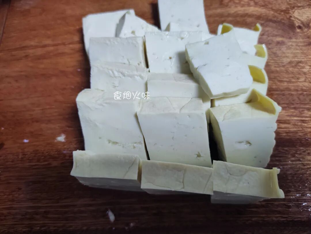 1.买回来的豆腐放在清水中,冲洗干净。洗净后的豆腐放在案板上,用刀将其切成小块,切好的豆腐放在一旁备用;